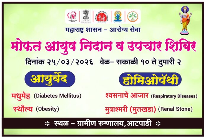 आटपाडी (प्रतिनिधी) : महाराष्ट्र शासनाच्या आरोग्य सेवा आयुष विभागांतर्गत आटपाडी येथील ग्रामीण रुग्णालयात बुधवार दिनांक २५ मार्च २०२६ रोजी सकाळी १० ते दुपारी २ या वेळेत मोफत आरोग्य शिबिराचे आयोजन करण्यात आले आहे. या शिबिरामध्ये जिल्ह्यातील तज्ञ डॉक्टर उपस्थित राहून नागरिकांना मार्गदर्शन व उपचार देणार आहेत.