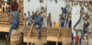 विषारी अजगराबरोबर नको ती स्टंटबाजी! पायाने १५ फुट सापाला पाण्यातून बाहेर...