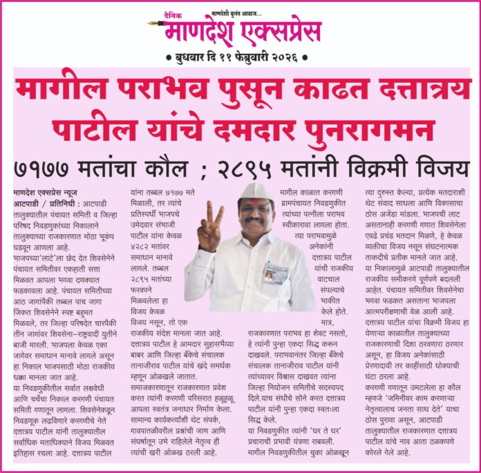 करगणी गणातून उमटलेला हा कौल म्हणजे ‘जमिनीवर काम करणाऱ्या नेतृत्वालाच जनता साथ देते’ याचा ठोस पुरावा असून, आटपाडी तालुक्यातील राजकारणात दत्तात्रय पाटील यांचे नाव आता ठळकपणे कोरले गेले आहे.