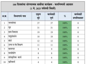 गेल्या १०० दिवसात या सर्व विभागांनी निश्चित केलेल्या ९०२ धोरणात्मक उद्दिष्टांपैकी ७०६ उद्दिष्टे (७८%) पूर्णतः साध्य केली आहेत तर उर्वरित १९६ उद्दिष्टे पूर्ण होईपर्यंत संबंधित विभाग आपले काम चालूच ठेवतील. एकूण ४८ विभागांपैकी १२ विभागांनी आपली १००% उद्दिष्ट पूर्तता केली आहे तर आणखी १८ विभागांनी ८०% पेक्षा जास्त उद्दिष्टे साध्य केली आहेत.